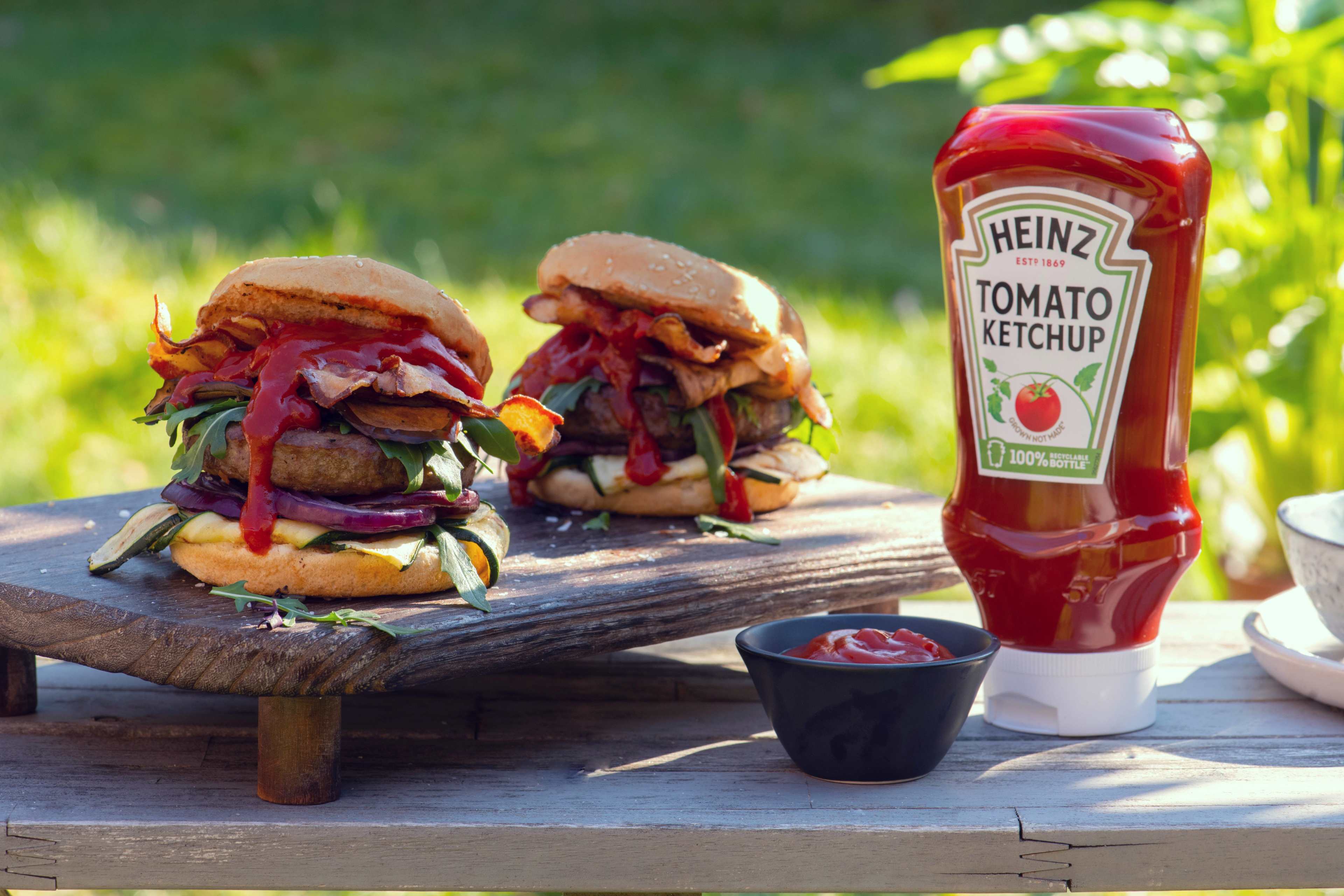 Die Burger mit den gegrillten Zwiebel- und Zucchinischeiben belegen. Dann die Aubergine, den Rucola und den Pancetta dazugeben. Mit Heinz Tomato Ketchup garnieren.
