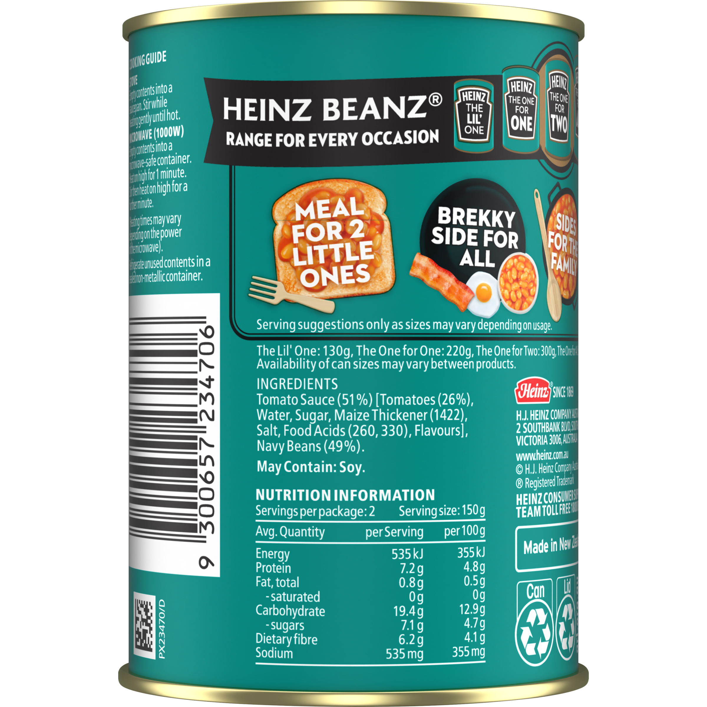Heinz Baked Beans in a deliciously rich tomato sauce - what's not to love? Heinz Beanz don't just taste great; they're high in dietary fibre, a source of protein and low in fat too. This canned food is a versatile pantry staple that can be enjoyed at any time of the day. Heinz Baked Beans are a classic favorite that can be enjoyed at any time of the day. Not only do Heinz Baked Beans have a deliciously rich tomato sauce, but they're also high in dietary fiber, a source of protein, and low in fat. They're a great meal option for kids and adults alike. Whether you like your baked beans in a toastie, on a baked potato, or as part of a big English breakfast, you really can't beat Heinz Baked Beans. They're a versatile food that can be enjoyed as a snack, a meal, or a side dish with dinner. In addition to being a perfect topping for toast, Heinz Beans can also be incorporated into casseroles, pasta sauces, pies, and Mexican dishes. So if you're looking for a delicious food to add to your meals, try Heinz Baked Beans today and discover why they're a beloved classic. • The One for Two • Baked beans in a delicious tomato sauce • Naturally high in dietary fibre and a source of protein • Versatile pantry staple • Low in fat