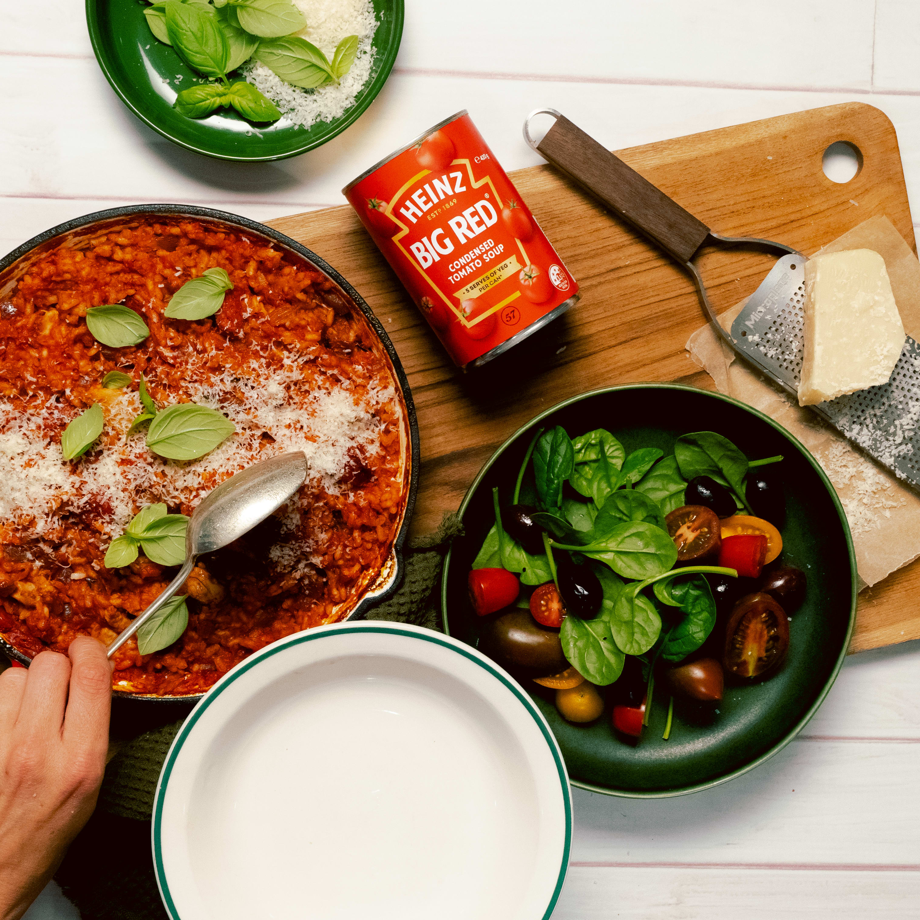 Pour over Heinz Big Red Soup, chopped tomatoes and ½ cup of water. Add oregano. Stir while bringing to the boil. Remove from the heat. Cover and transfer to the oven. Cook for 25 - 30 minutes. Remove from the oven and stir. There will still be some liquid which will absorb into the rice on standing. Rice should be cooked but still be firm to the bite. Garnish with chopped parsley. Serve with a good sprinkling of grated parmesan cheese and black pepper. Accompany with your favourite steamed green vegetables or a crisp green salad on the side.