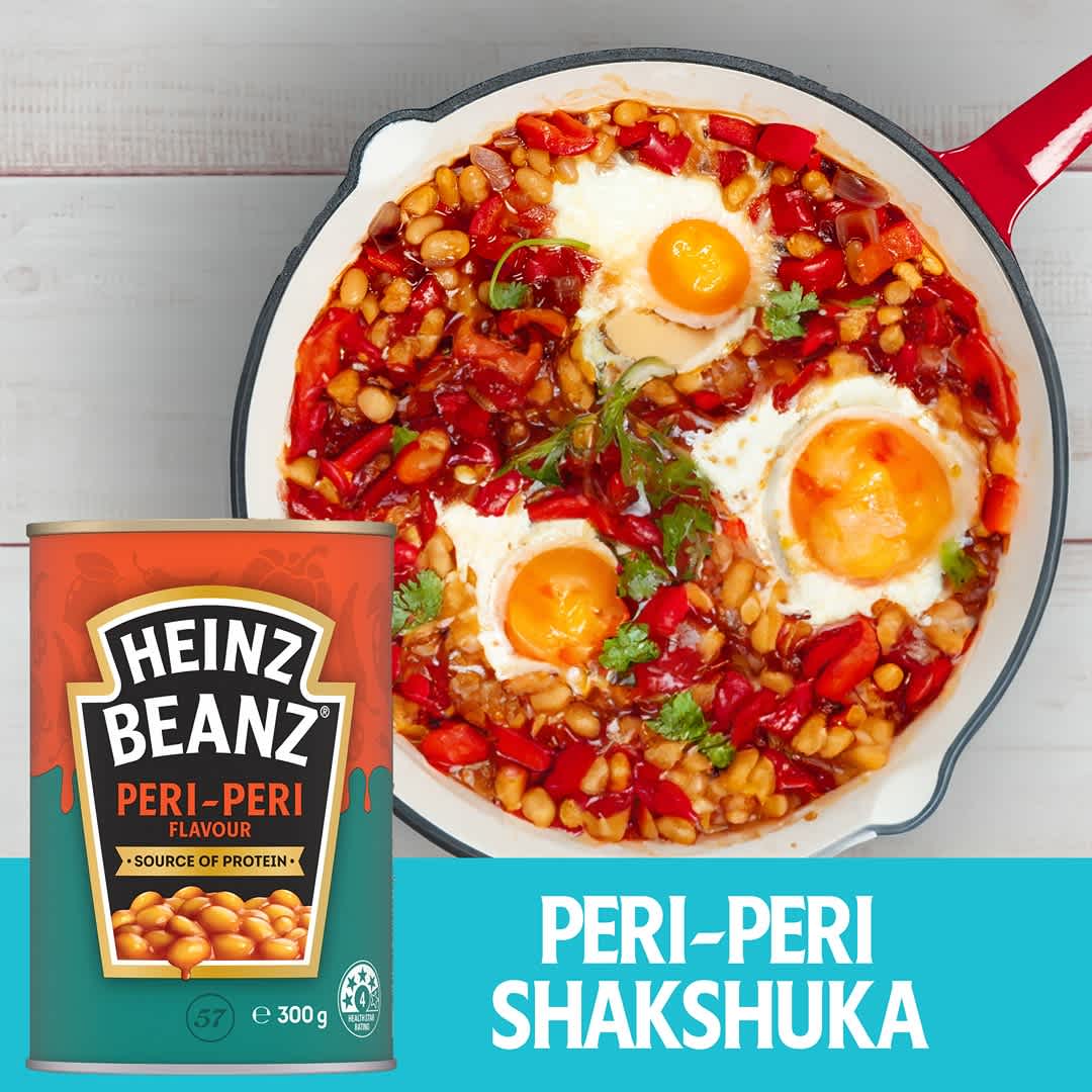 Stir in the Heinz Beanz Peri-Peri Flavour, then turn the heat to low. Make 4 small hollows in the bean mixture and gently crack an egg into each hollow. You can crack the eggs into a small bowl first, then ease each into the pan.