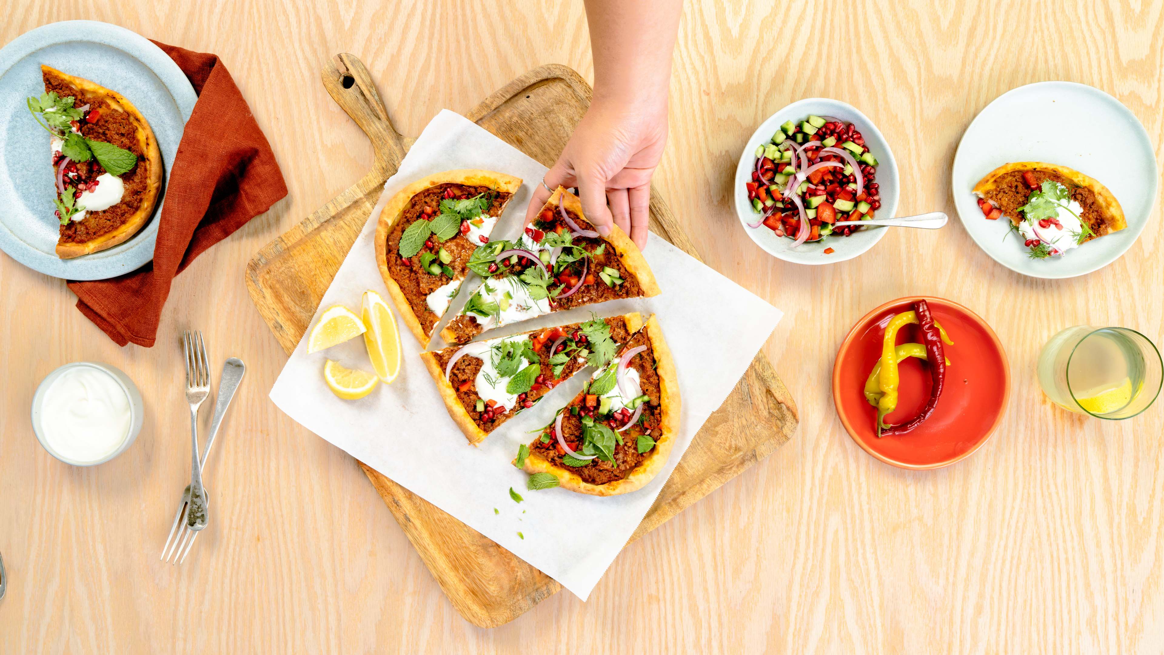 Once baked, serve the pide topped with yoghurt, herbs and salad.