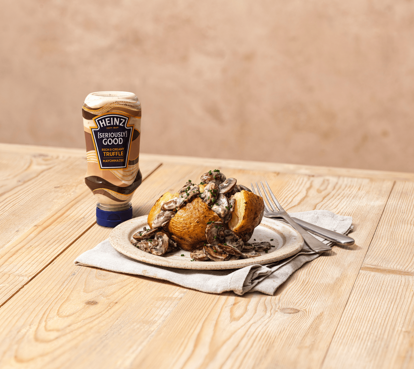 Warm the remaining oil in a frying pan add the sliced mushrooms, fry for 5 minutes or until just starting to brown, allow to cool for 5 minutes before stirring through the Heinz Truffle Mayonnaise.
