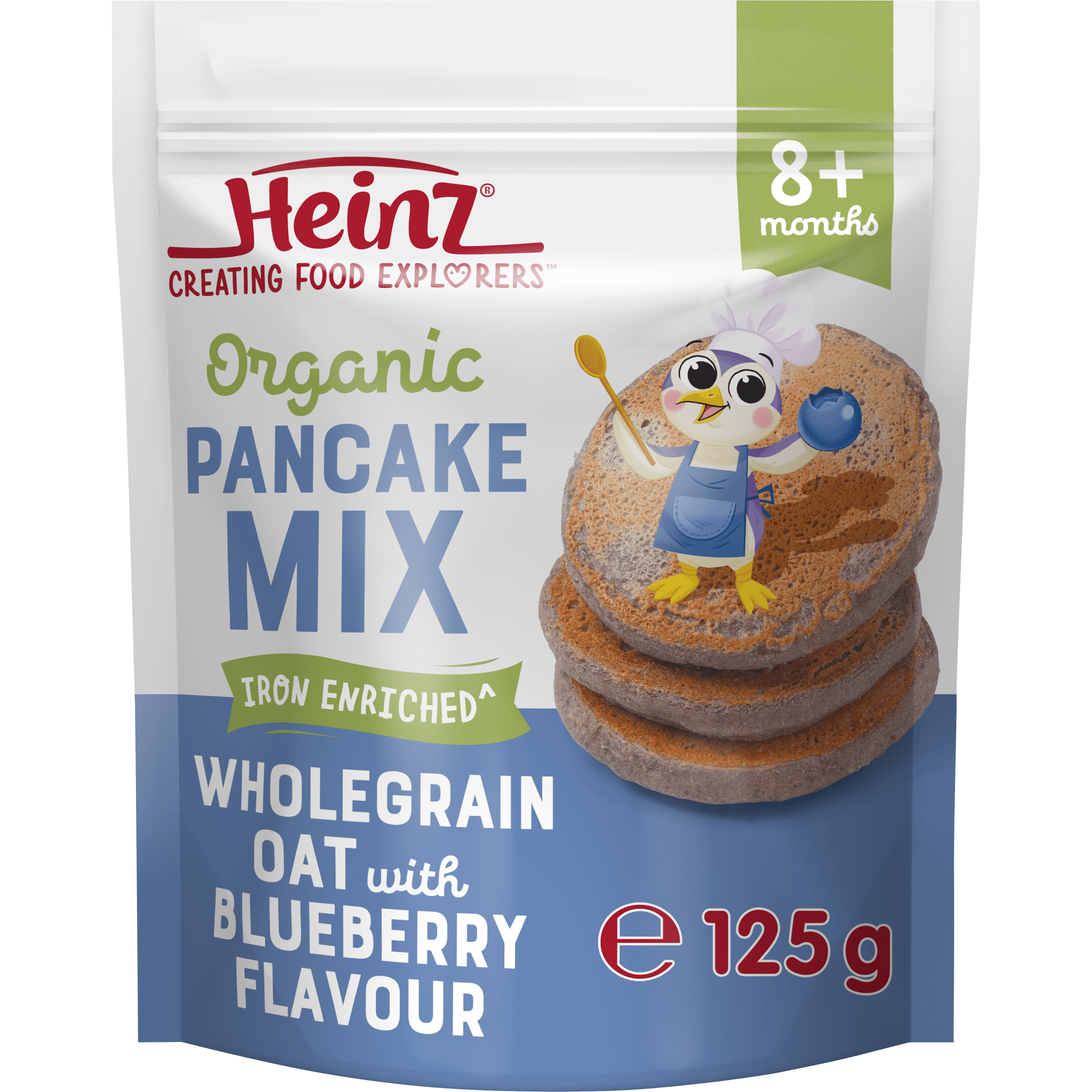 Ideal for busy mornings, Heinz® Creating Food Explorers™ Organic Pancake Mix Wholegrain Oat with Blueberry Flavour is an easy snack option for you and your little one. Just add a splash of milk and oil, whisk and cook! Make snack times even easier with Heinz® Creating Food Explorers™ Organic Pancake Mix Wholegrain Oat with Blueberry Flavour. Created specifically for ages eight months and up, this yummy pancake mix is iron enriched^ and contains no artificial flavours. Serve as-is or with extra blueberries on top. • For babies aged 8+ months • Makes six soft pancakes • Iron enriched (^Average Quantity per Serving As Prepared with 3 Tbsp. milk + 1 tsp. oil) • No artificial flavours • Simply mix, cook and serve!