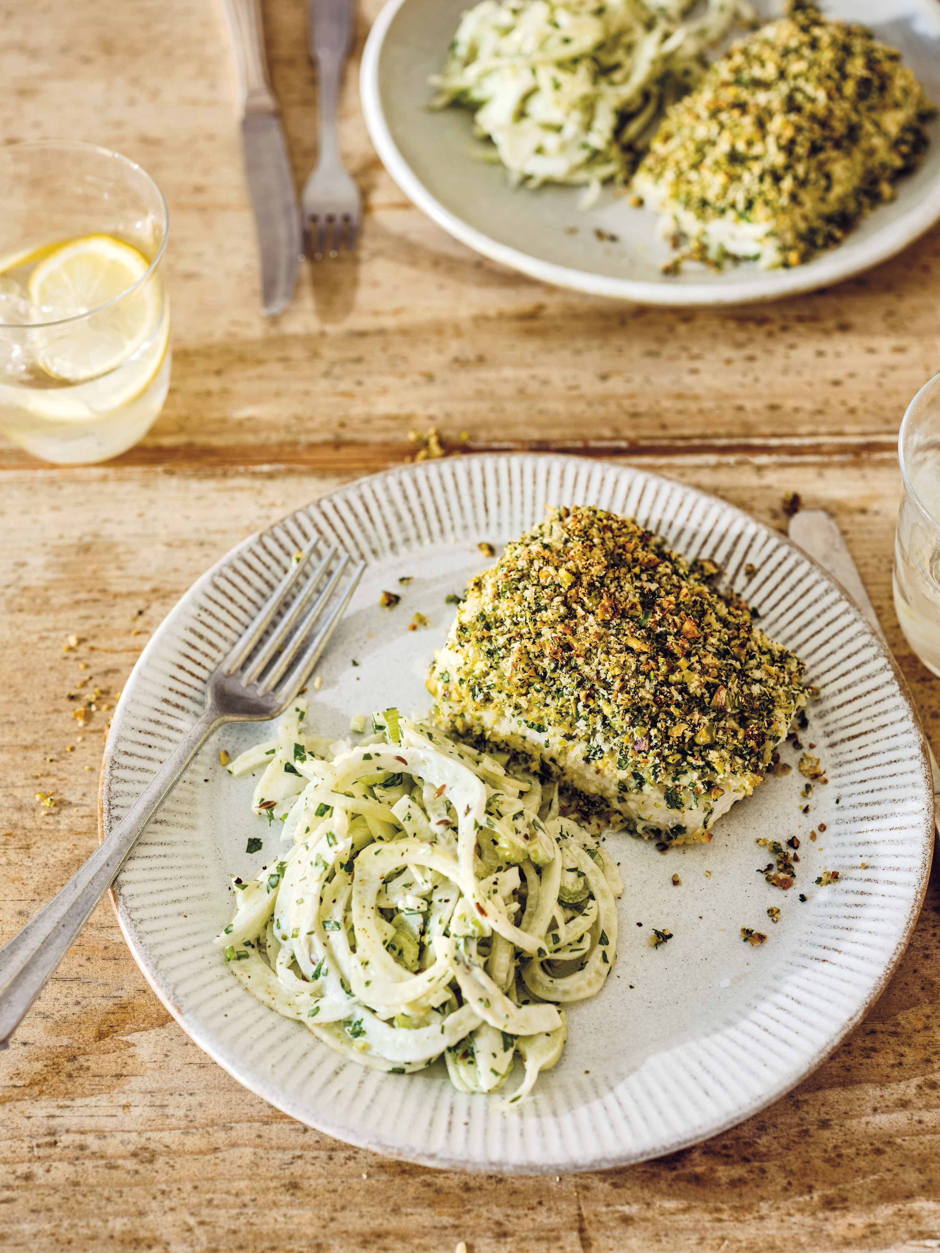 Sirve la merluza en costra junto con la ensalada de hinojo y semillas de comino.
