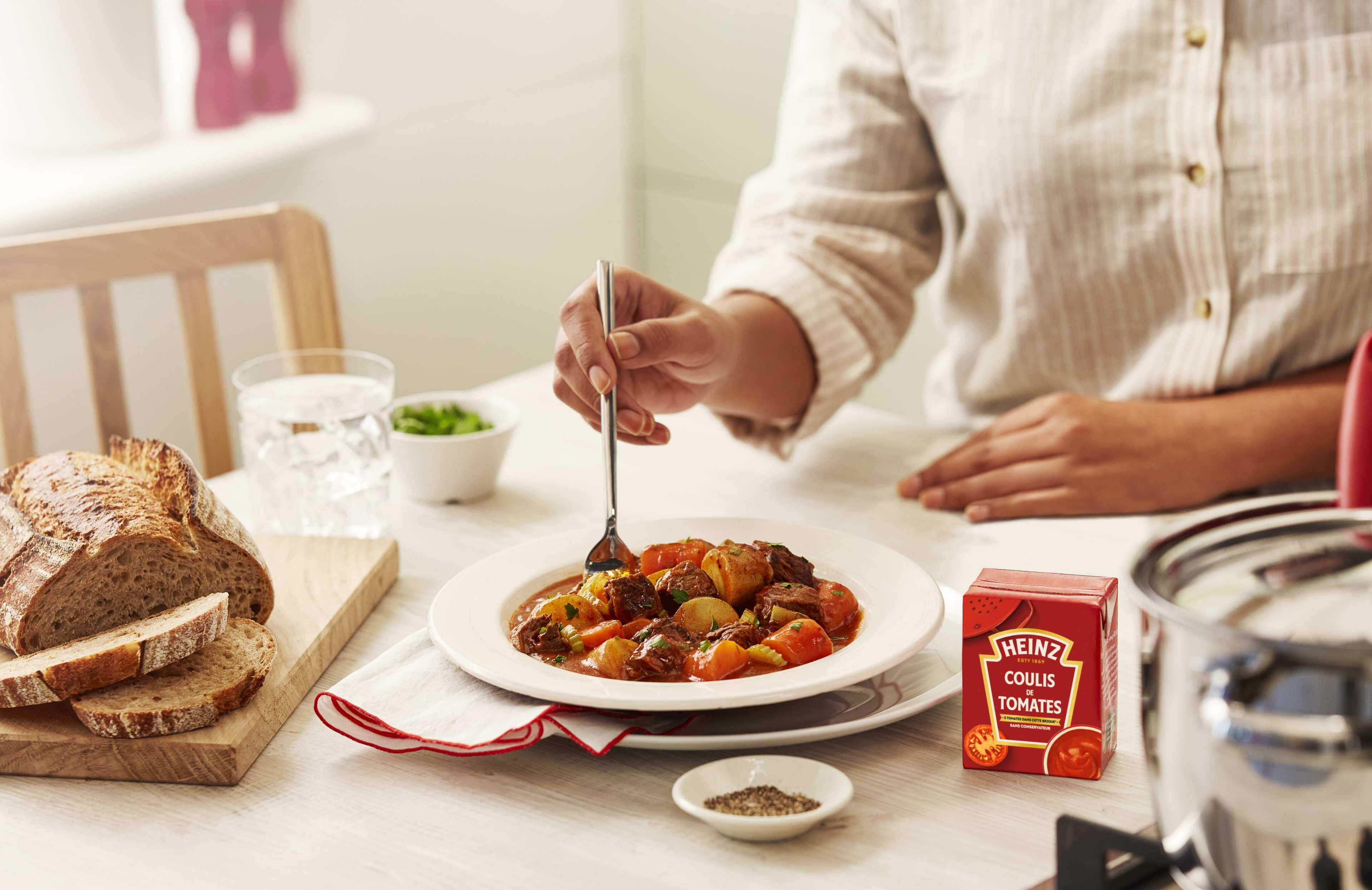 Verser sur le bouillon en grattant le fond de la casserole pour déglacer, ajouter les légumes, les herbes et le bœuf poêlé avec le jus. Incorporer le coulis de tomates Heinz, porter le ragoût à ébullition avant de couvrir et de réduire à feu doux.
