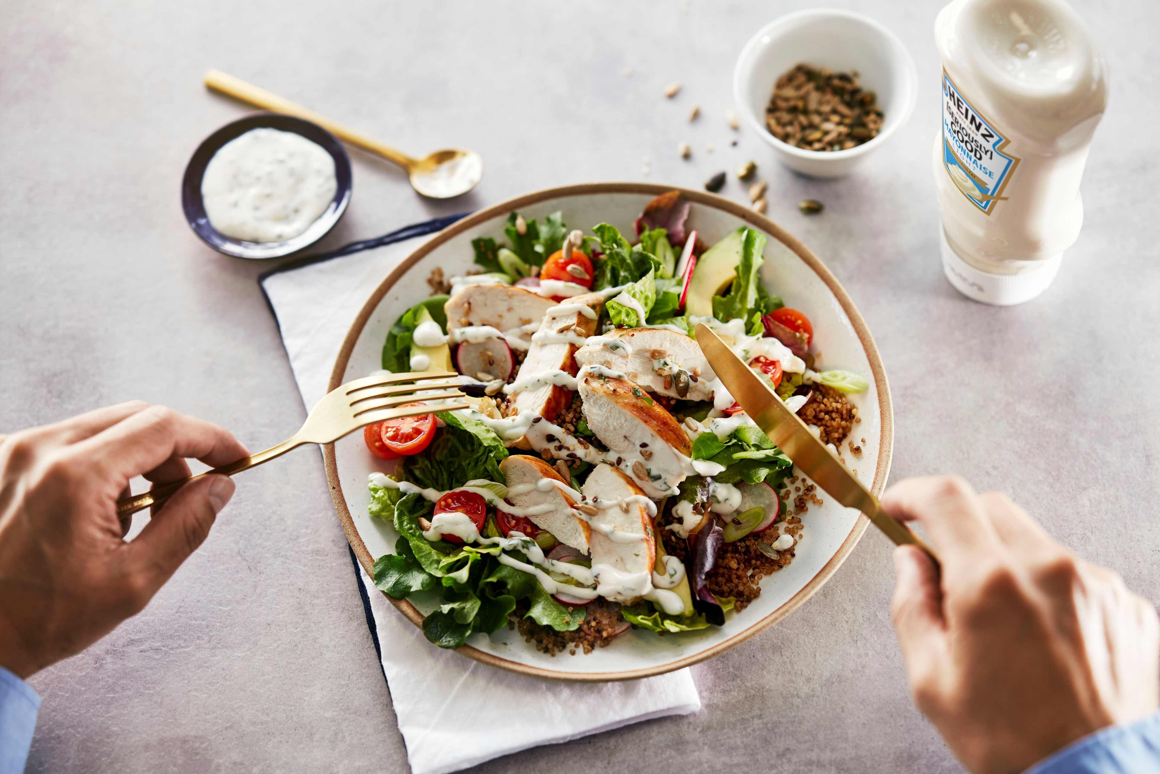 Assembler la salade en commençant par la laitue, en ajoutant le quinoa cuit et tous les légumes. Placer le blanc de poulet sur le dessus, éparpiller les graines de courge selon votre goût et assaisonner avec la Mayonnaise Heinz.