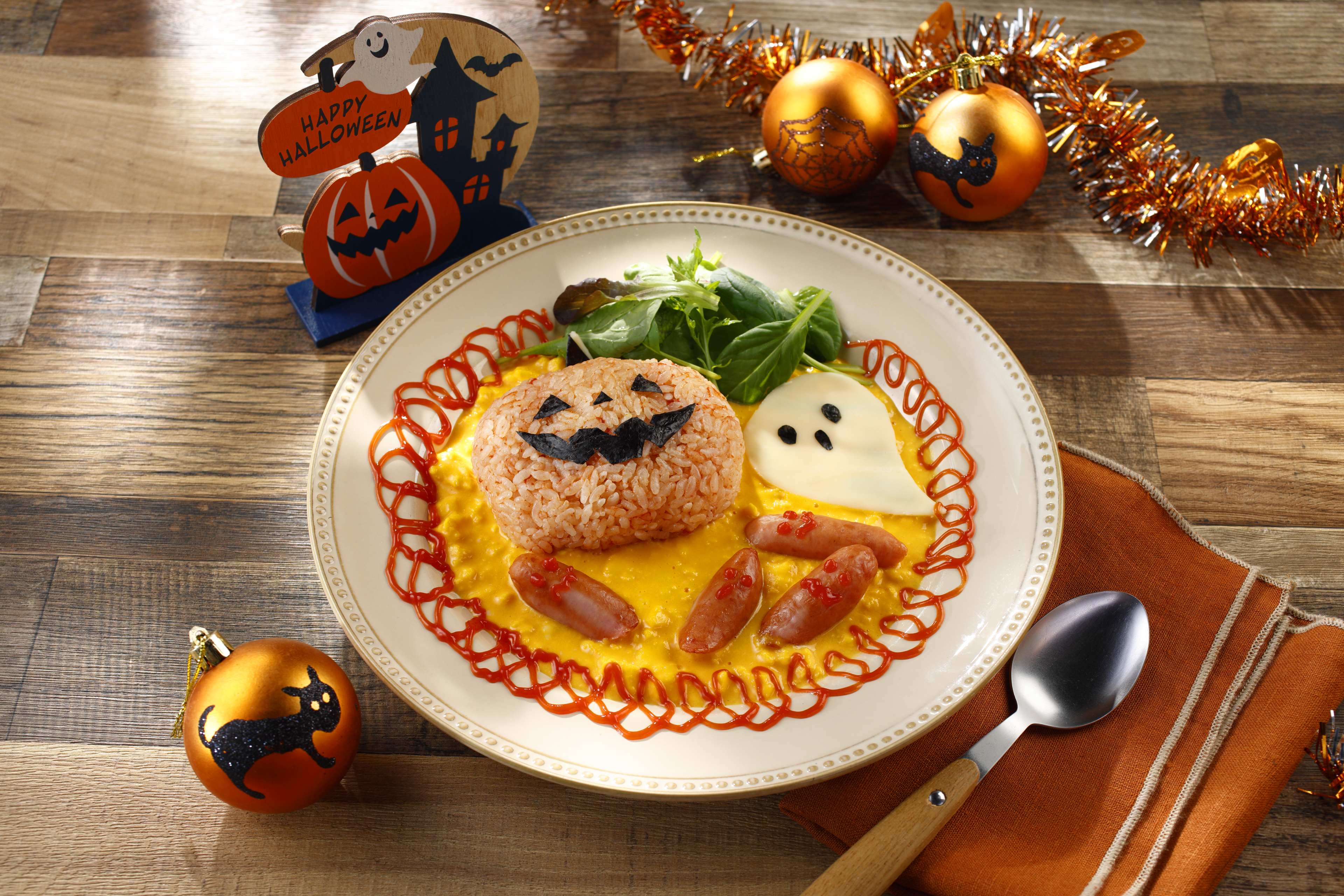 レンジで簡単にとろとろ卵を作って、ケチャップライスで作ったジャックオーランタンをのせたらあべこべのオムライスの出来上がり!